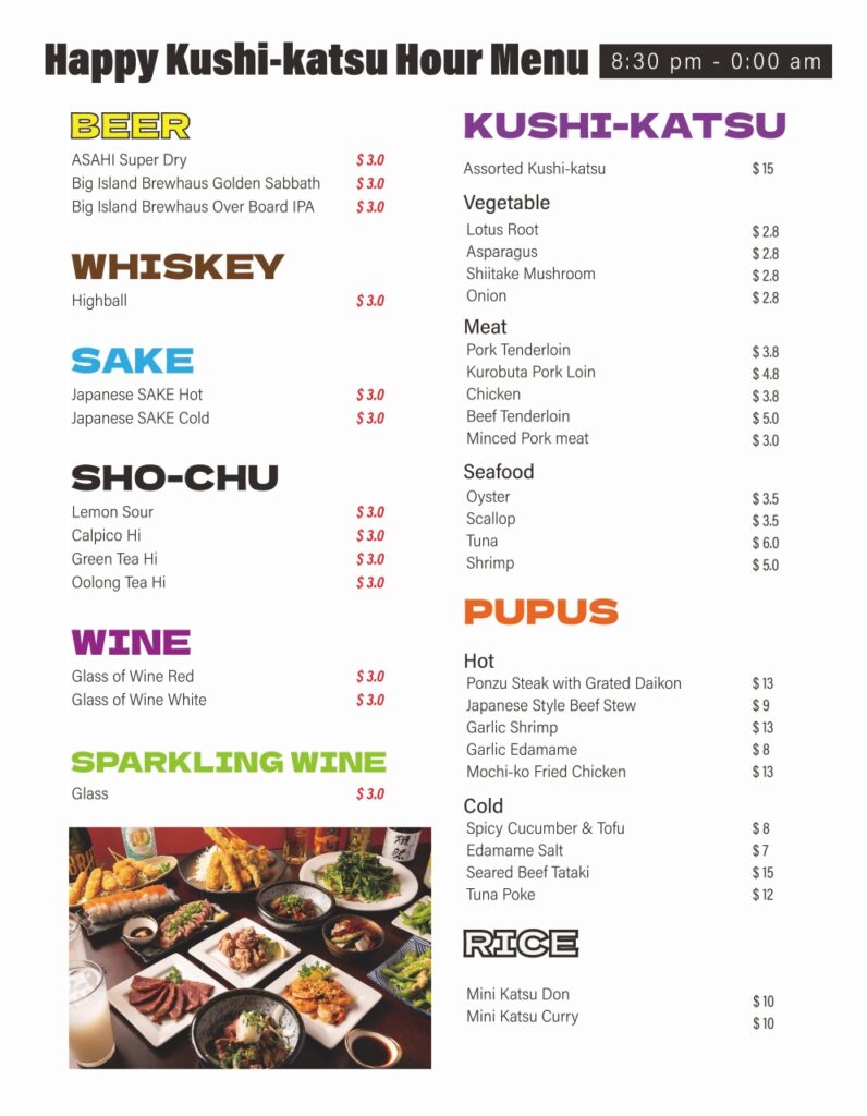 Join us every night from 8:00 PM to 12:00 AM (Midnight) for our newly enhanced “SUGOI Awesome Happy Hour.” Whether you’re looking for a second spot after dinner or a late-night bite, we’ve got the best deals in Waikiki!